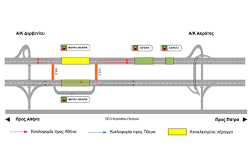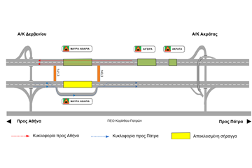 Αποκλεισμός του κλάδου προς Πάτρα και εκτροπή της κυκλοφορίας στην παράπλευρη βοηθητική οδό των σηράγγων, όπως φαίνεται στο ακόλουθο σχηματικό διάγραμμα. Η κυκλοφορία προς Αθήνα δεν επηρεάζεται.
