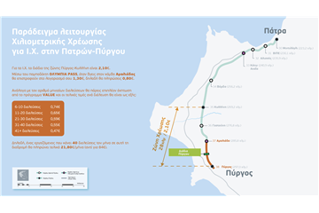 Επιπλέον, για τα Ι.Χ. οχήματα, η χιλιομετρική χρέωση συνδυάζεται με το εκπτωτικό πρόγραμμα VALUE, προσφέροντας συνολικό οικονομικό όφελος που μπορεί να φτάσει έως και πάνω από 78%, ανάλογα με τη συχνότητα χρήσης. Συγκεκριμένα, για έναν εργαζόμενο που κάνει 40 διελεύσεις μέσα στον μήνα στη διαδρομή Πύργος-Αμαλιάδα, το αρχικό κόστος είναι 84€, ενώ μετά την εφαρμογή της Χιλιομετρικής Χρέωσης και σε συνδυασμό με το εκπτωτικό πρόγραμμα VALUE μέσω του πομποδέκτη ΟΛΥΜΠΙΑ PASS, θα πληρώσει 21,80€ (δηλαδή θα κοστίζει 0,55€ η διέλευση, έκπτωση 74%).