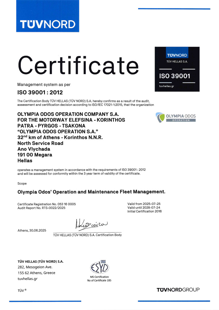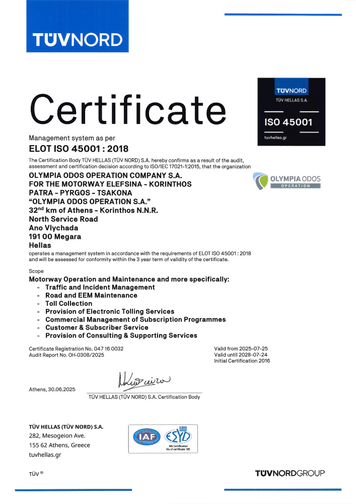 Olympia Odos Operation S.A. has adopted an Integrated Quality, Environment, Road Safety and Health & Safety Management System for the operation, according to the requirements of the standards ISO 9001:2015, ISO 14001:2015, ISO 39001:2012 & ISO 45001:2018 respectively, committing itself to observe specific procedures for the management and monitoring of the project's operation and maintenance, for the safe transit of the vehicles through the motorway, for the toll collection and the customers’/subscribers’ service, for the environmental protection, for the safe circulation of its marked vehicles, as well as for the care taken for the health and safety of the entire human power, fully responding to the rules of art and science.