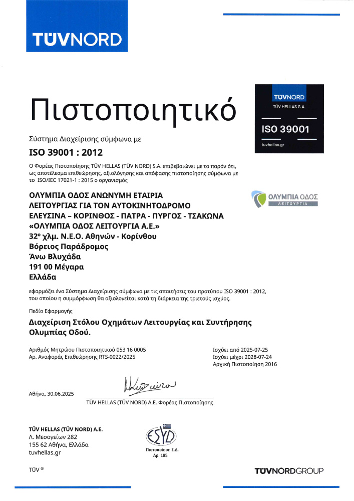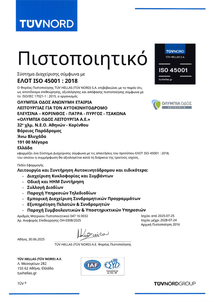 H Ολυμπία Οδός Α.Ε. εφαρμόζει Ολοκληρωμένο Σύστημα Διαχείρισης (IMS) πιστοποιημένο από τον διεθνή φορέα TÜV HELLAS (TÜV NORD), στα πεδία: